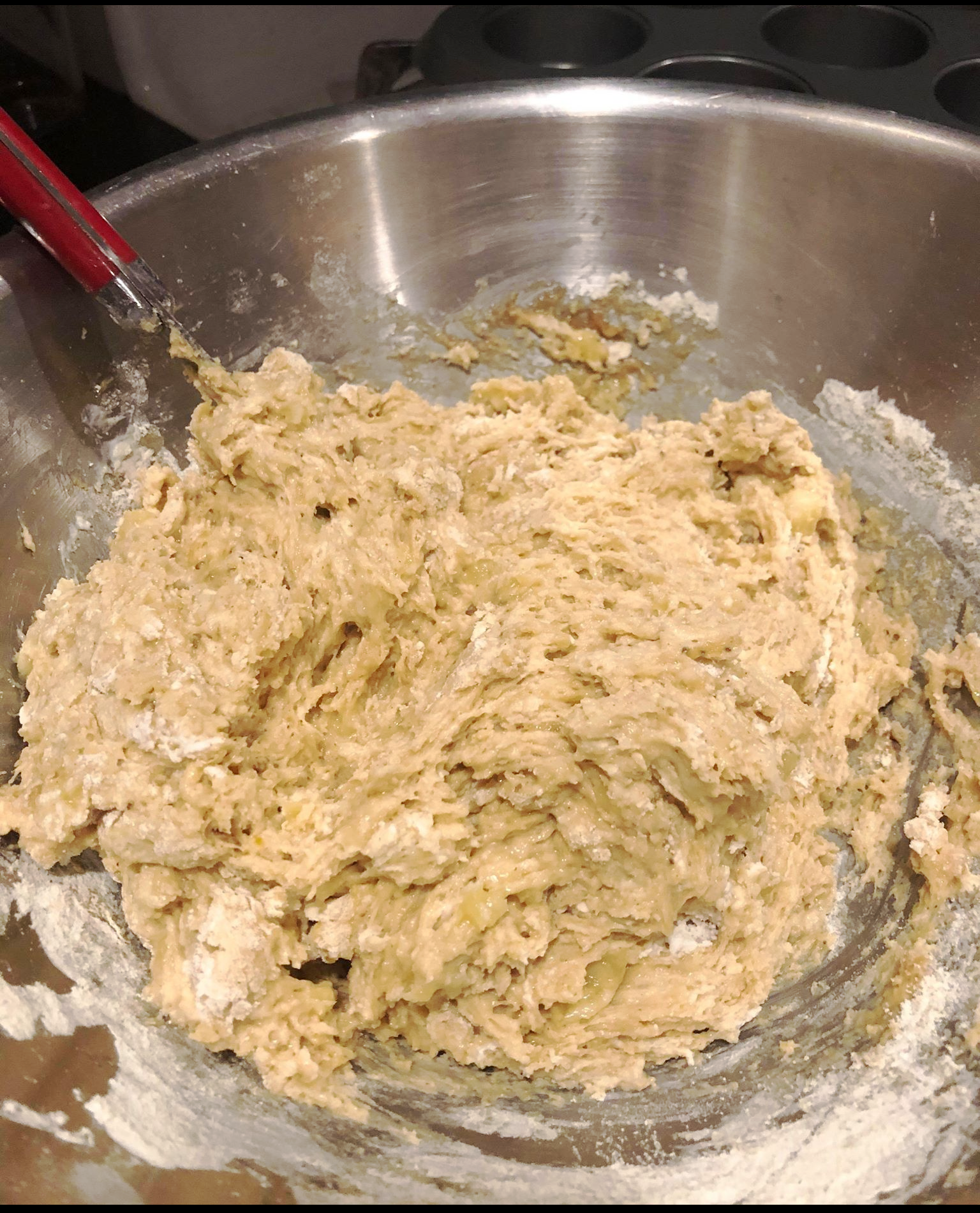 This time around, I used this cinnamon swirl banana bread recipe as a jumping-off point, though I did not follow it directly. I made muffins instead of a loaf (for easier snacking), didn’t do the cinnamon swirl, and instead put cinnamon and nutmeg directly into the dough (because I wasn’t sure if muffins would have room for individual swirls), and eyeballed a lot of the measurements (which I do not recommend).